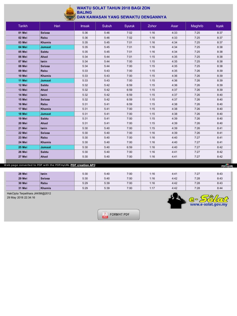 Waktu Solat Kawasan Baling Kedah Mei 2018 Pdf